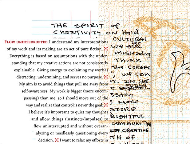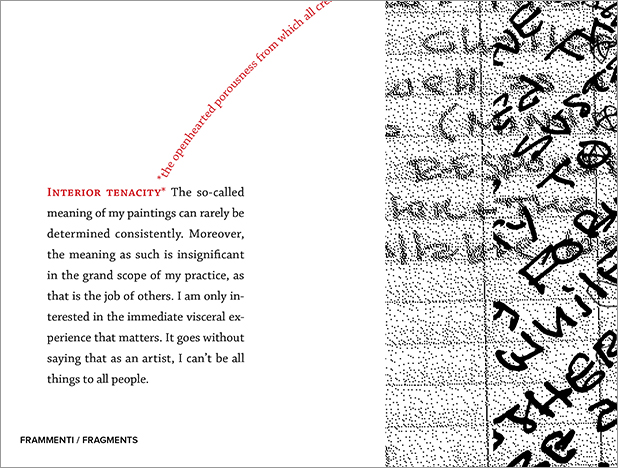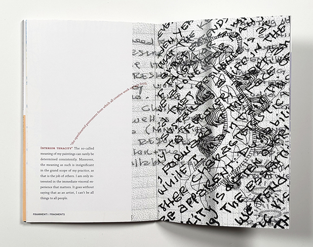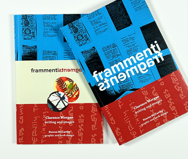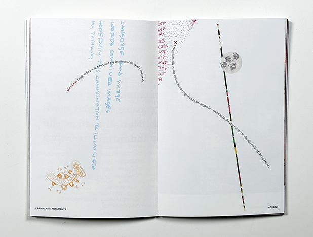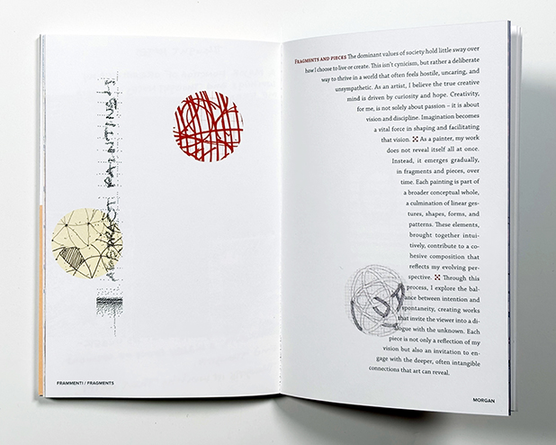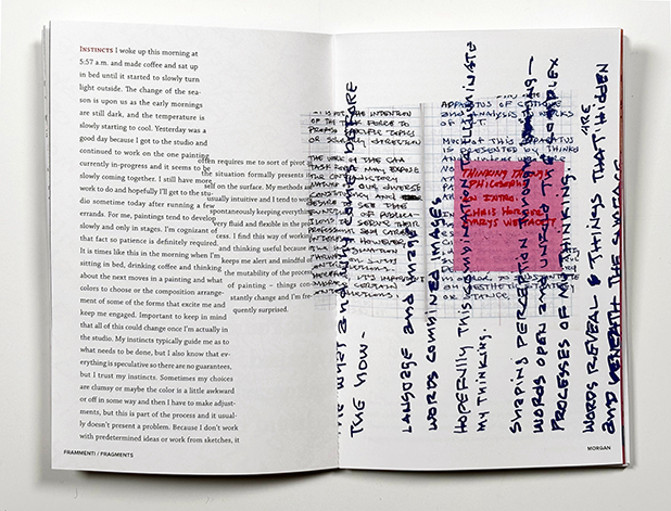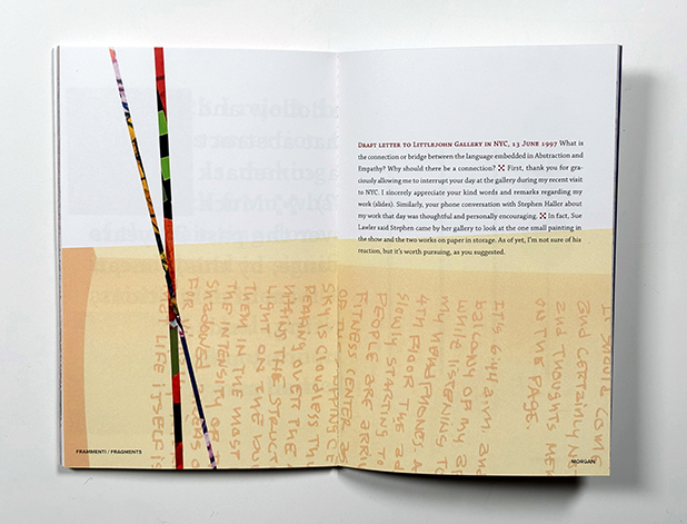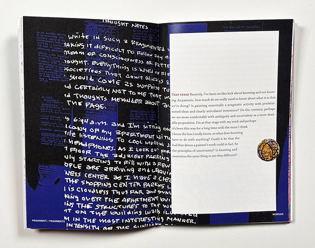FRAMMENTI / FRAGMENTS FRAMMENTI / FRAGMENTS is a compilation of the journal writings – the “thought notes,” both typewritten and scanned original scripts – of artist Clarence Morgan. The writings span several decades, and are occasionally accompanied by selected images of his abstract paintings. This rich material has been graphically interpreted and remixed by designer and book artist Steven McCarthy into this collaborative work. McCarthy composes pages, spreads and sections, and considers books as akin to films or performances, or to handheld works of conceptual architecture. His approach to layout might be thought of as “painterly,” with attention to mark-making, typographic pattern, color, value, texture, contrast and so on. In his remix, however, McCarthy’s respect for both the content (Morgan’s words and images) and a functional, albeit expressive, graphic form (that the book’s eventual reader must decode) is honored. This book’s fragments are a subset of larger, whole works. But they also make something new, also whole and yet different from their sources through graphic actualization. In this alternative context, Morgan’s active thoughts meet McCarthy’s thoughtful actions. The book’s bilingual title (Italian / English) is concurrently redundant and expansive, and inspired by Morgan’s time in Rome during the summer of 2024. The cut-out affixed to the cover is an actual fragment of an original artwork by Morgan. The book has 110 full-color pages and the edition of 100 was printed by Smart Set of Minneapolis. ___ DISSEMINATION Collections: