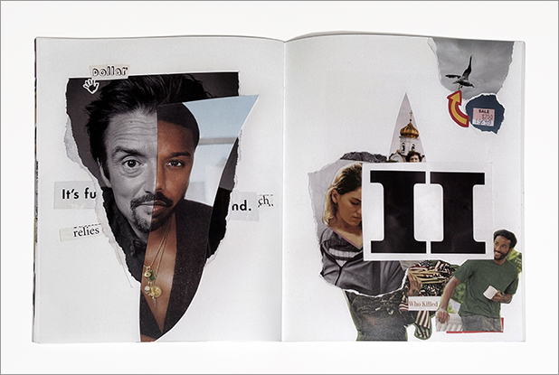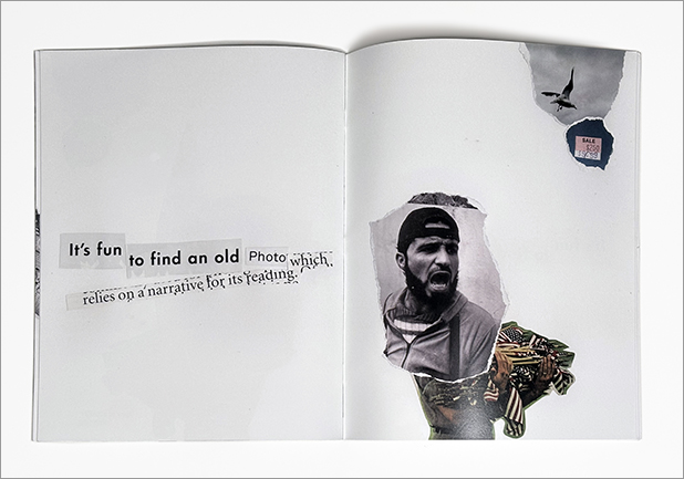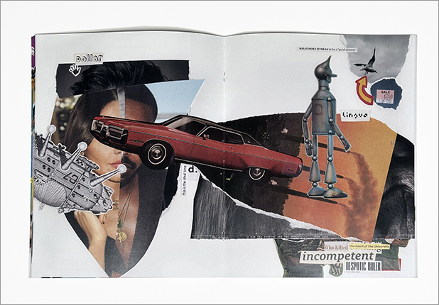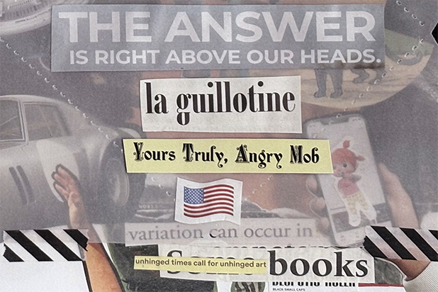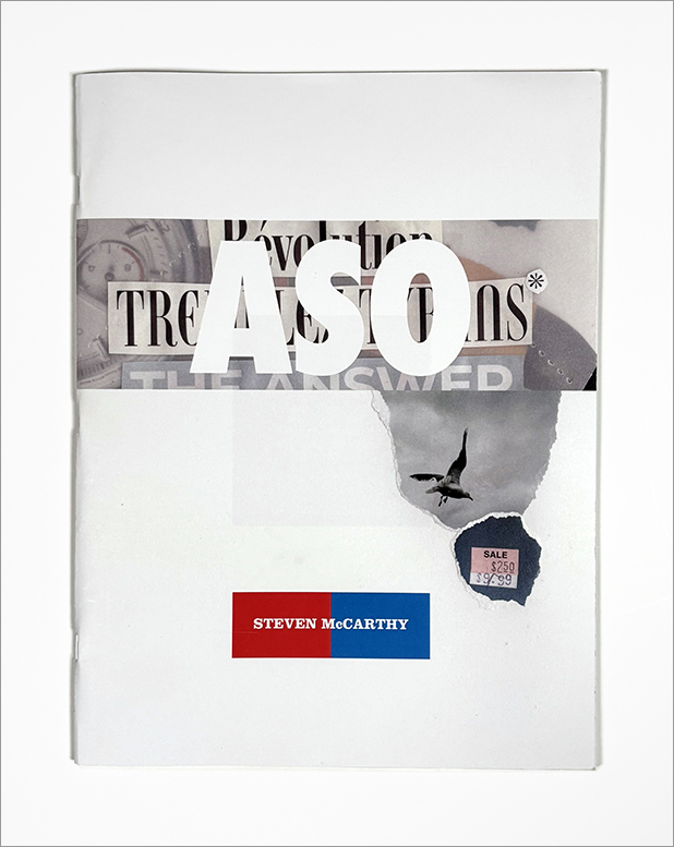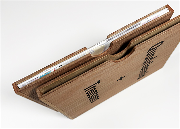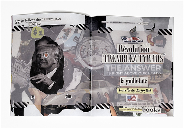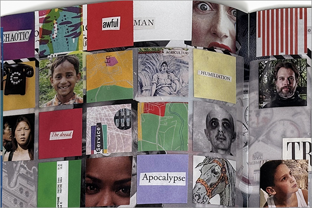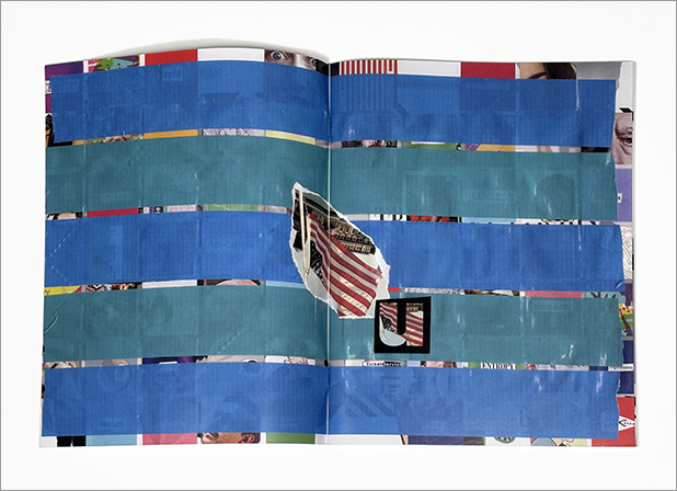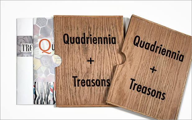 Opening spreads show an overwhelming grid of color blocks, words and images of faces that depict the fraught times in which we live. Eventually the grid dissolves, revealing a dark, chaotic and sinister spread. But by suggesting the tool used in the French Revolution to good effect for traitors, a solution may be at hand (or at neck). Consequent pages peel back layers of reasons: allusions to economics, liberty, education, technology, the environment. Eventually, elements disappear from the book's pages and the compositions become more stark. At the end, only humor remains. Treasons cites reasons... The book is 9 x 12" and has 48 full-color pages. The edition of 100 was printed onto premuim 80# text paper by Smart Set of Minneapolis. Treasons is available bundled with its companion book Quadriennia in a handmade oak box (see pictures at bottom of web page). ___ DISSEMINATION